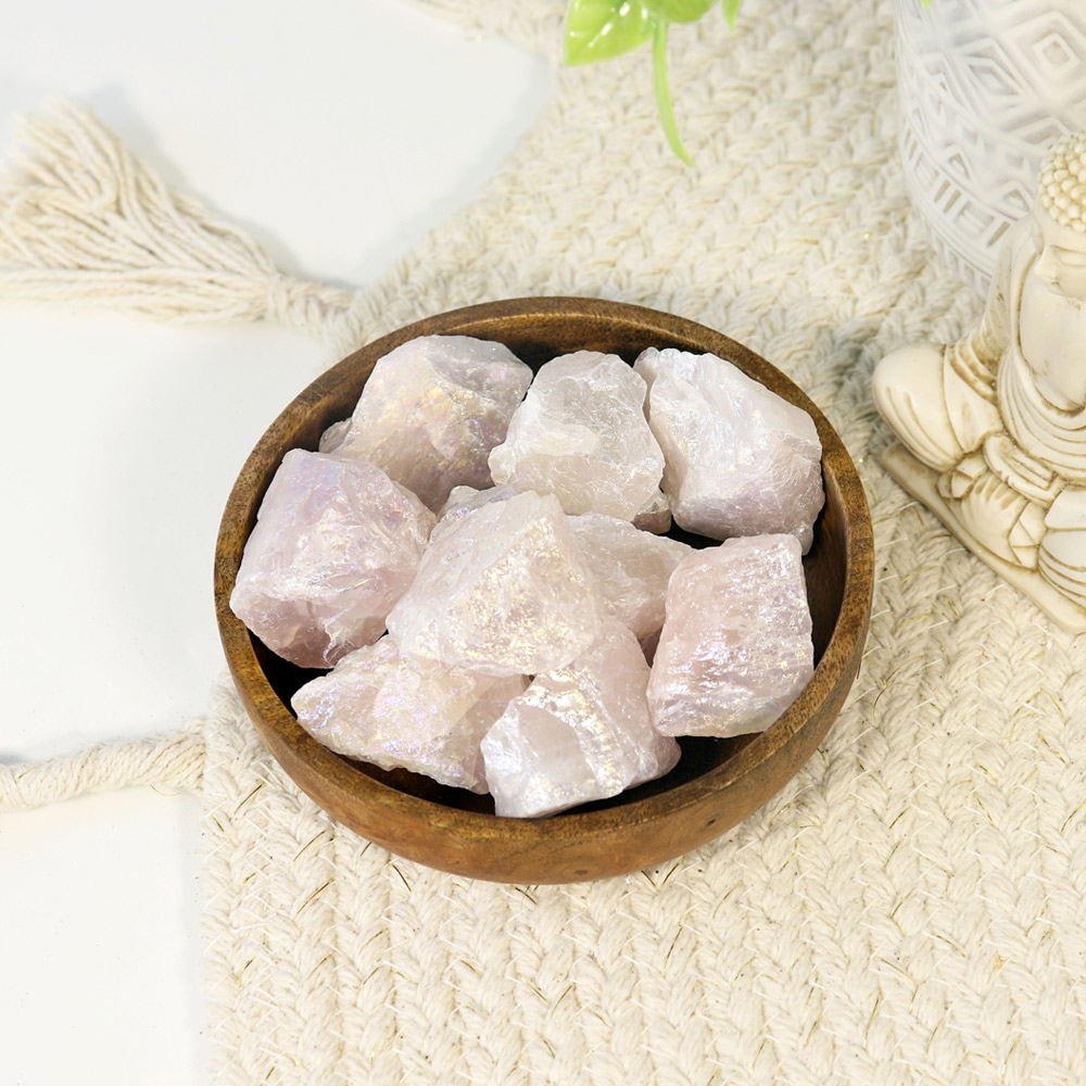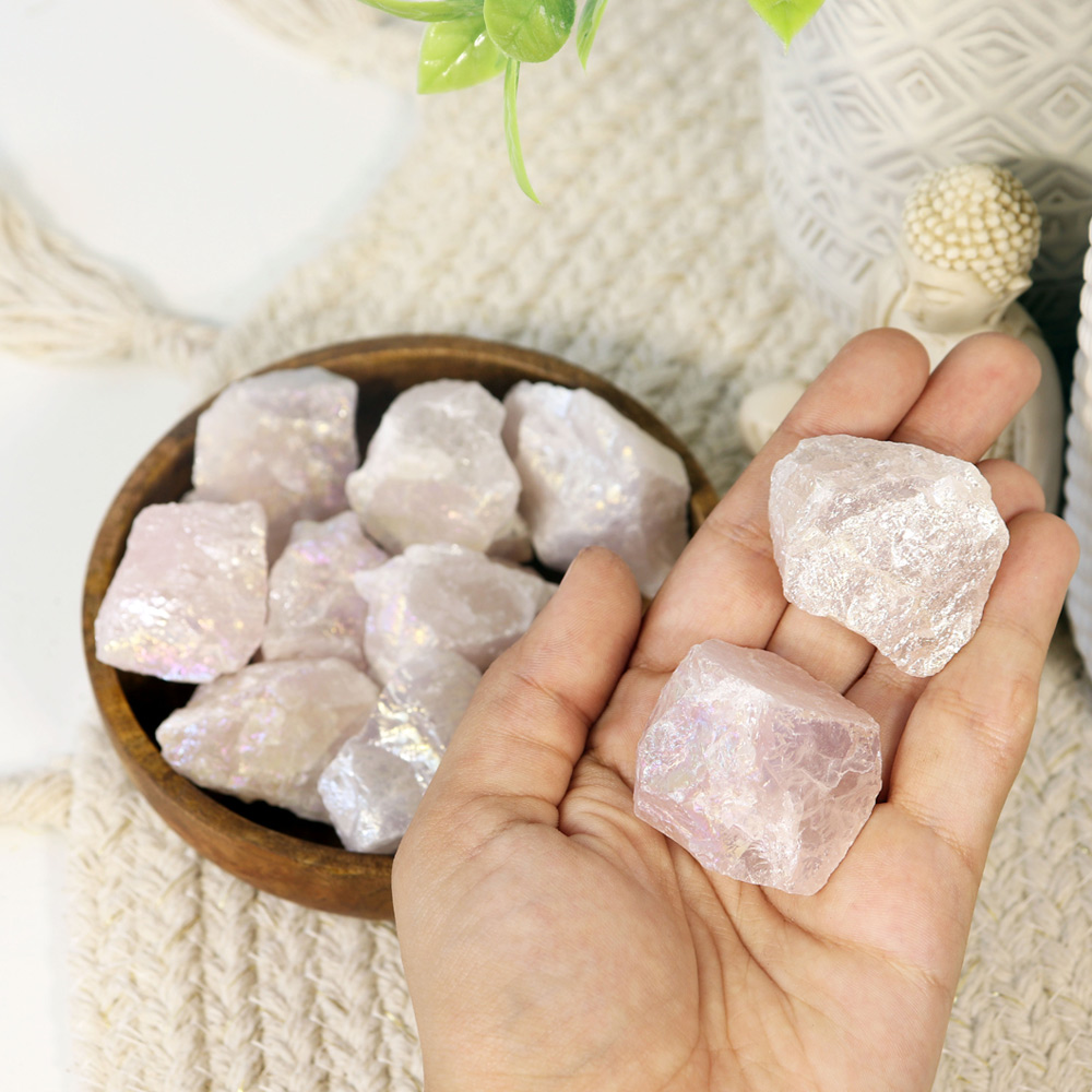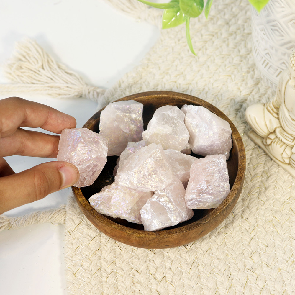 Aura Rose Quartz is Rose Quartz fused with Platinum to give it the iridescence. Platinum brings grounding energy that connects with the loving vibrations of Rose Quartz and intensifies its properties becoming a stone of supreme love. Aura Rose Quartz draws cleanses one?s aura. It stimulates the Heart Chakra and attracts positive and loving energy. It calms nerves, bringing inner peace and helps to communicate and act with grace. Aura Rose Quartz inspires self-love as well as love for others. Ideal for Meditation as it heals the physical and spiritual bodies with its high vibrations. Perfect crystal for ones facing loneliness and anxiety. With its angelic rainbow sheen, it is perfect addition to Home d?cor. Add our Aura Rose Quartz Chunks to your stores to offer mesmerizing healing crystals to your customers